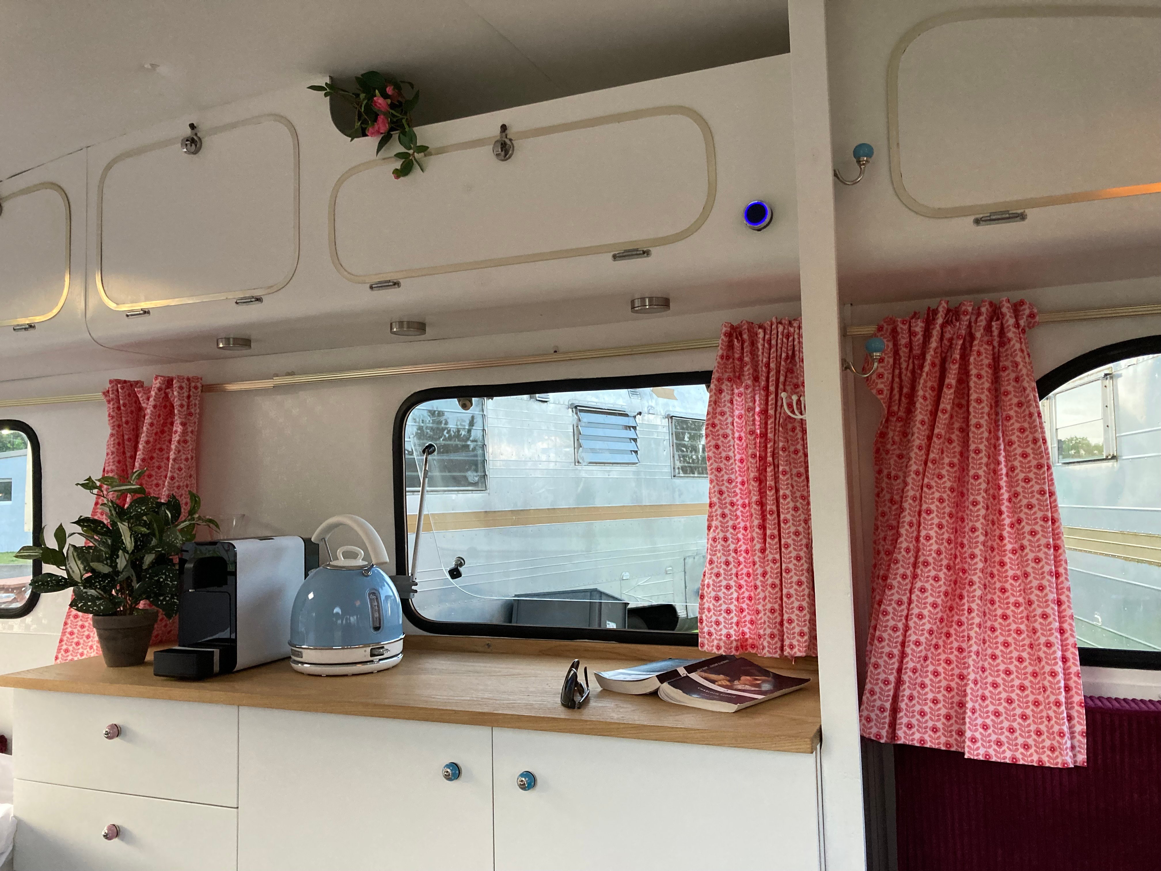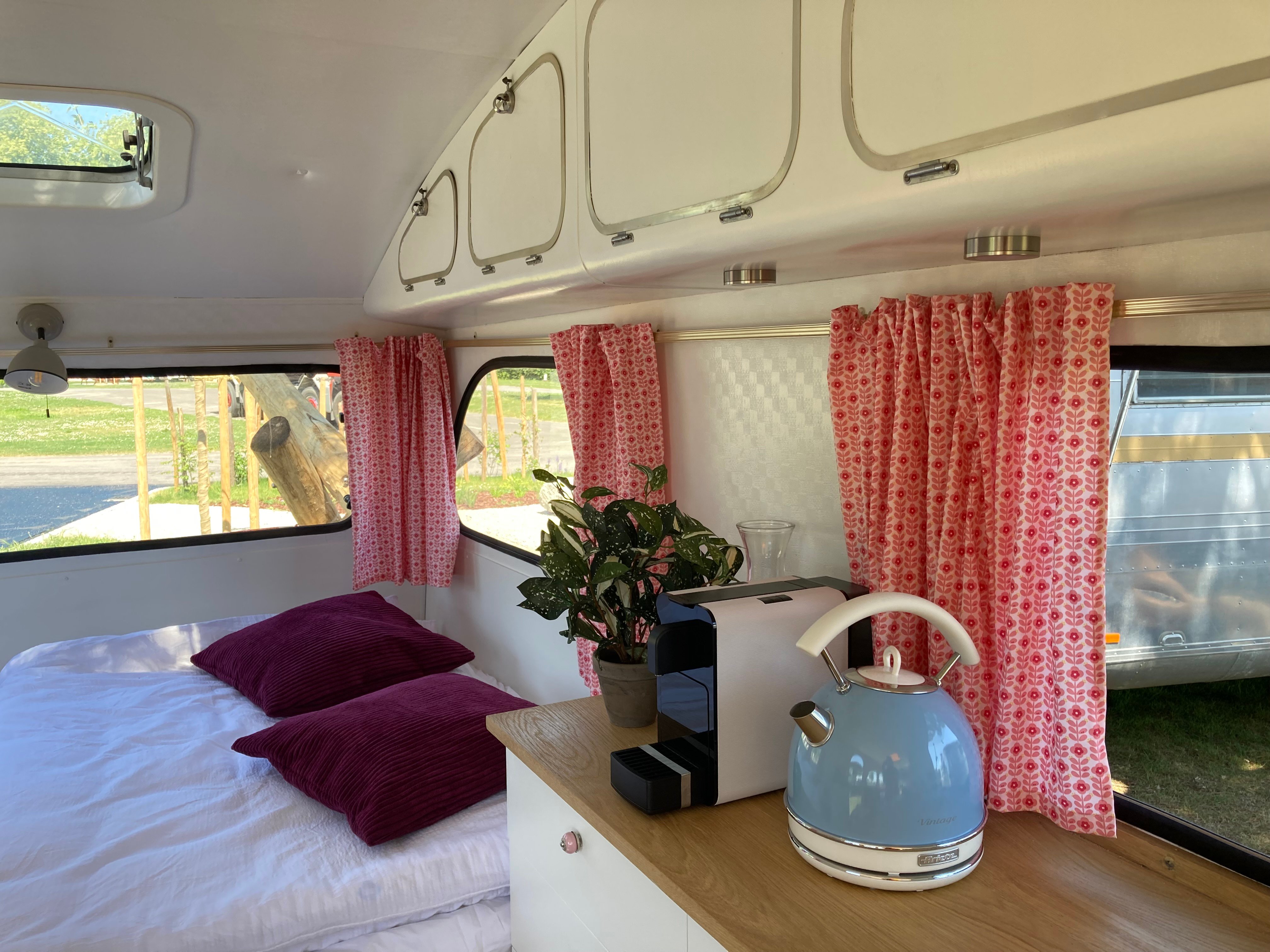 Quoi de plus séduisant et de plus excitant que de passer quelques jours dans une caravane issue d’une époque révolue ! Notre caravane vintage est un petit bijou hors du commun entièrement refait à neuf. Certains détails caractéristiques du véhicule ont été conservés, d’autres entièrement modernisés. Un lit double confortable, une table et des banquettes, un réfrigérateur, une machine à café et d’autres éléments de confort sont les garants d’un séjour agréable. Une petite terrasse meublée complète votre petit paradis de vacances.
