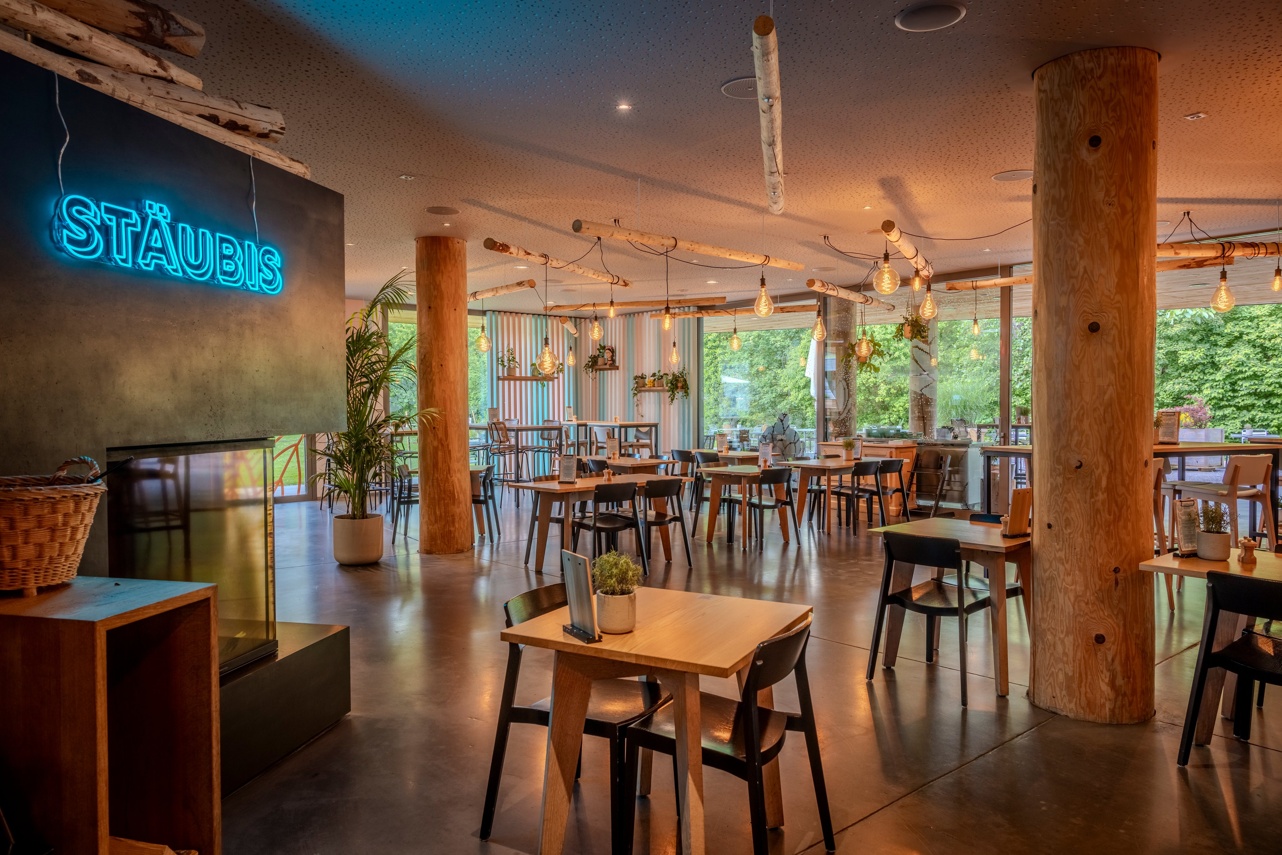 Le restaurant Stäubis allie un design moderne et une hospitalité chaleureuse à une vue imprenable sur la région unique des plaines alluviales du Rhin.
